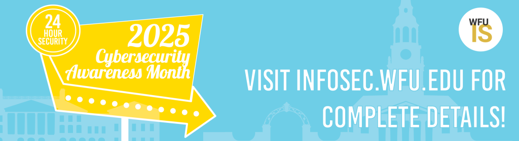October is National Cybersecurity Awareness Month, a nationwide campaign dedicated to increasing awareness of Internet security and promoting the resources available to stay safe online. Throughout the month, the WFU Information Systems’ cybersecurity team will be providing a variety of tips and tools to help you protect your data. Keep an eye out for our upcoming communications as IS shares valuable information and best practices to empower you against online threats.