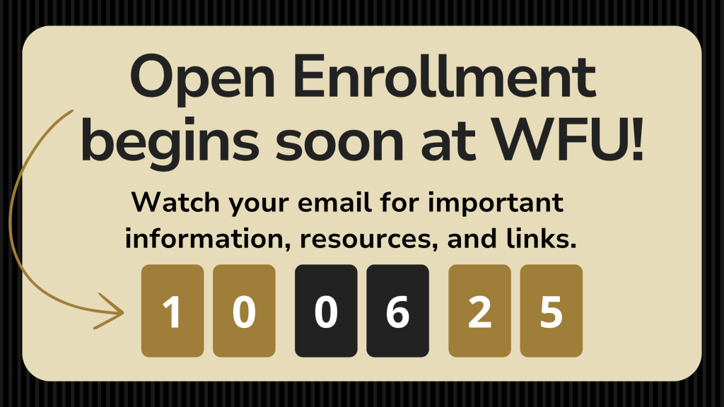 WFU’s 2025 Open Enrollment period will run from Monday, Oct. 6, through Friday, Oct. 17. Beginning Oct. 6, you must enroll via Workday if you are changing benefit elections, adding or removing a dependent(s), and/or planning to participate in a Flexible Spending Account (FSA).