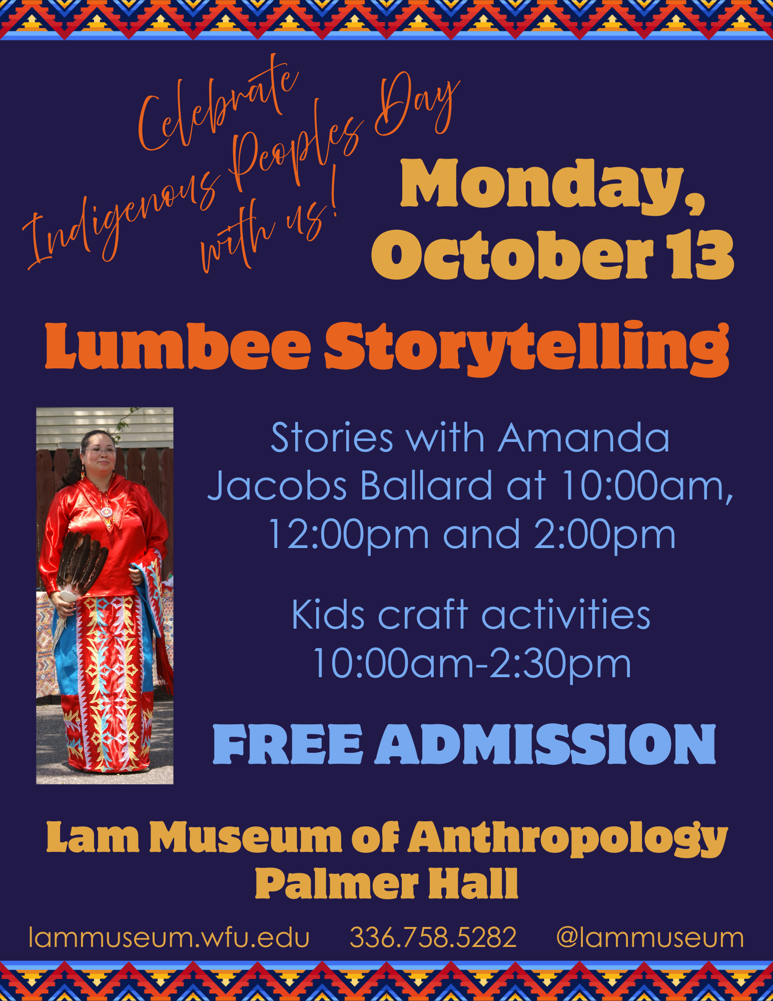 Join the Lam Museum’s annual Indigenous Peoples Day celebration on Monday, Oct. 13, with a kid-friendly day of crafts and stories of how things came to be. Amanda Jacobs Ballard, a member of the Lumbee (Tuscarora and Waccamaw-Siouan) tribe of N.C. and indigenous storyteller, dancer, and artist, will be telling stories at the following times: 10 a.m., 12 p.m., and 2 p.m. Craft activities will also be available throughout the day.