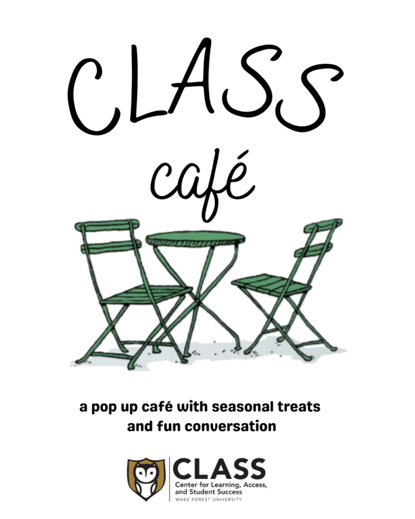 Students, faculty, and staff are invited to the fall CLASS Café on Wednesday, Oct. 8, in front of Reynolda Hall on Hearn Plaza. Drop in anytime between 3 and 4:30 p.m. to celebrate the academic year with seasonal treats and fun conversation.