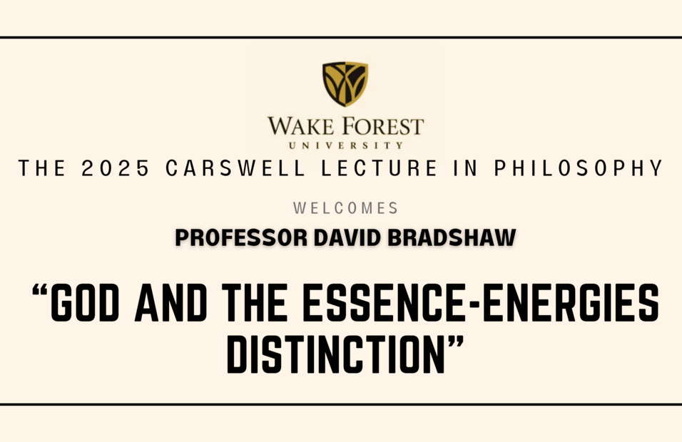 The 2025 Carswell Lecture in Philosophy will take place on Thursday, Oct. 2, at 5 p.m. in the Philosophy Library, Tribble Hall B316. David Bradshaw, Professor of Philosophy at the University of Kentucky, will present his talk, “God and the Essence-Energies Distinction.” A detailed abstract can be found on the Philosophy Department website along with more information about the department’s Speaker Series.