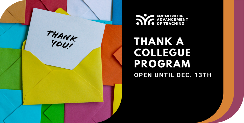 As we near the end of the semester, the Center for the Advancement of Teaching invites you to participate in their Thank a Colleague program as a way to recognize your colleagues’ efforts. You fill out a short online form, and the CAT compiles and forwards the responses along to recipients at the end of the semester. Please submit your notes of gratitude by Dec. 13. Visit the Program & Services page on the CAT website for more information.