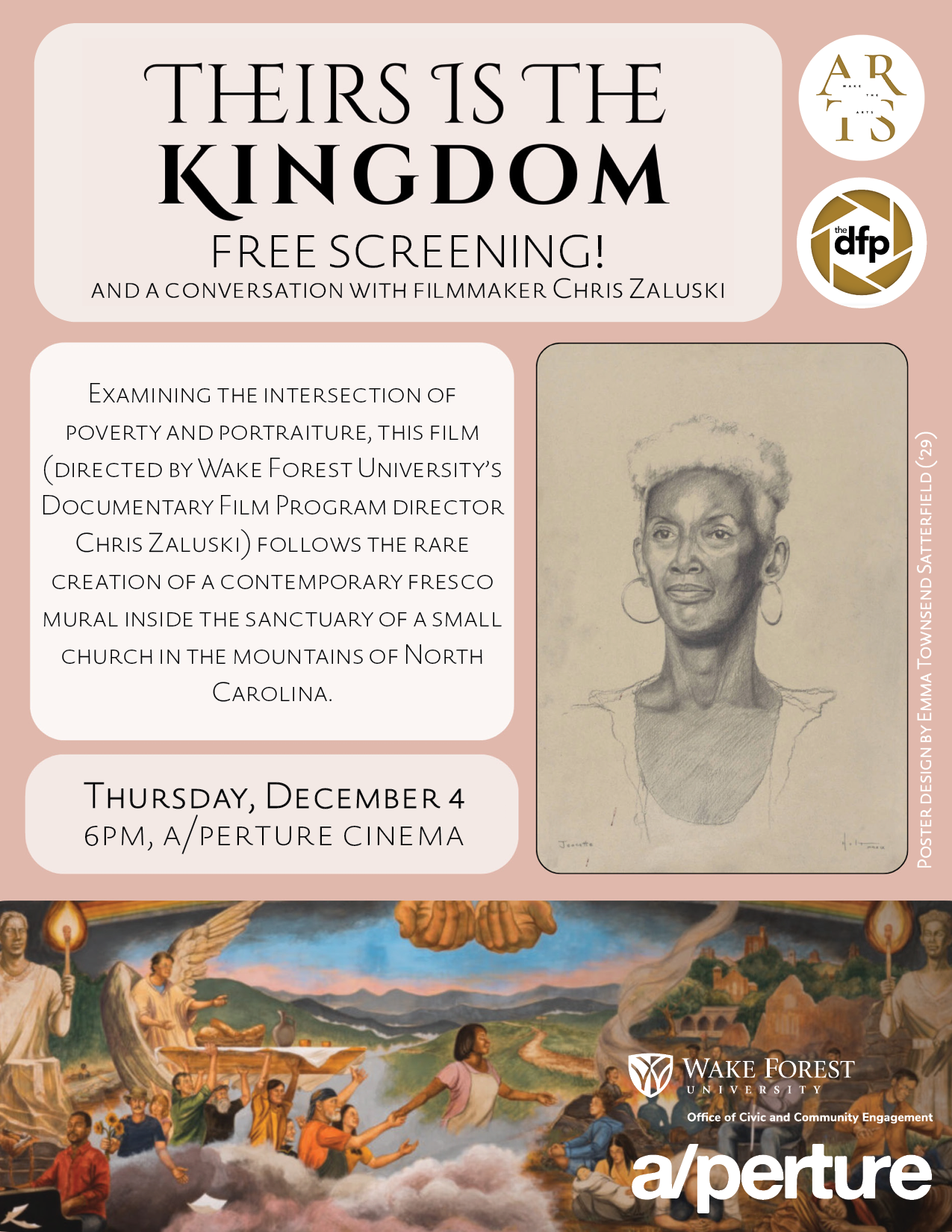 On Thursday, Dec. 4, at 6 p.m., a/perture cinema will show a free screening of Theirs is the Kingdom, a 60-minute documentary film directed by WFU Documentary Film Program Director Chris Zaluski. The film follows the rare creation of a contemporary fresco mural inside the sanctuary of a small church in Asheville, examining the intersection between poverty and portraiture.