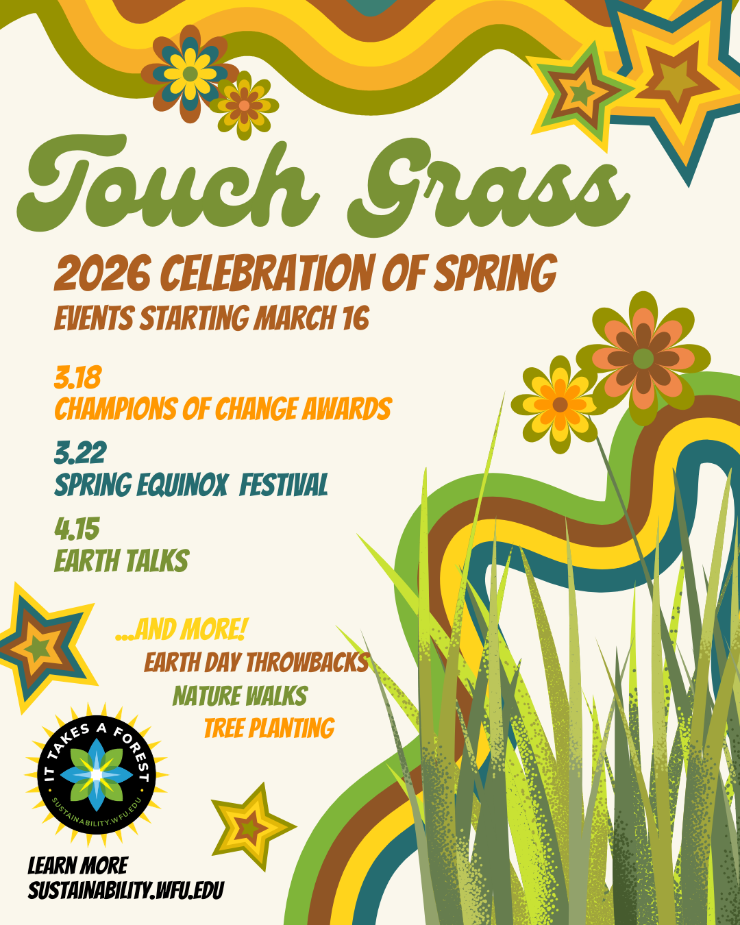 Welcome spring at Wake Forest with events, written reflections, and opportunities to turn your screen time into green time. With this year’s campuswide celebration, take moments to connect with nature and feel moments of wonder, interconnectedness, and experience shifts in perspective throughout the season. Visit the Office of Sustainability’s website to learn more and get involved. Join an upcoming event, submit your own, or share your reflection for a chance to be featured in their social media series. Email sustainability@wfu.edu with questions.