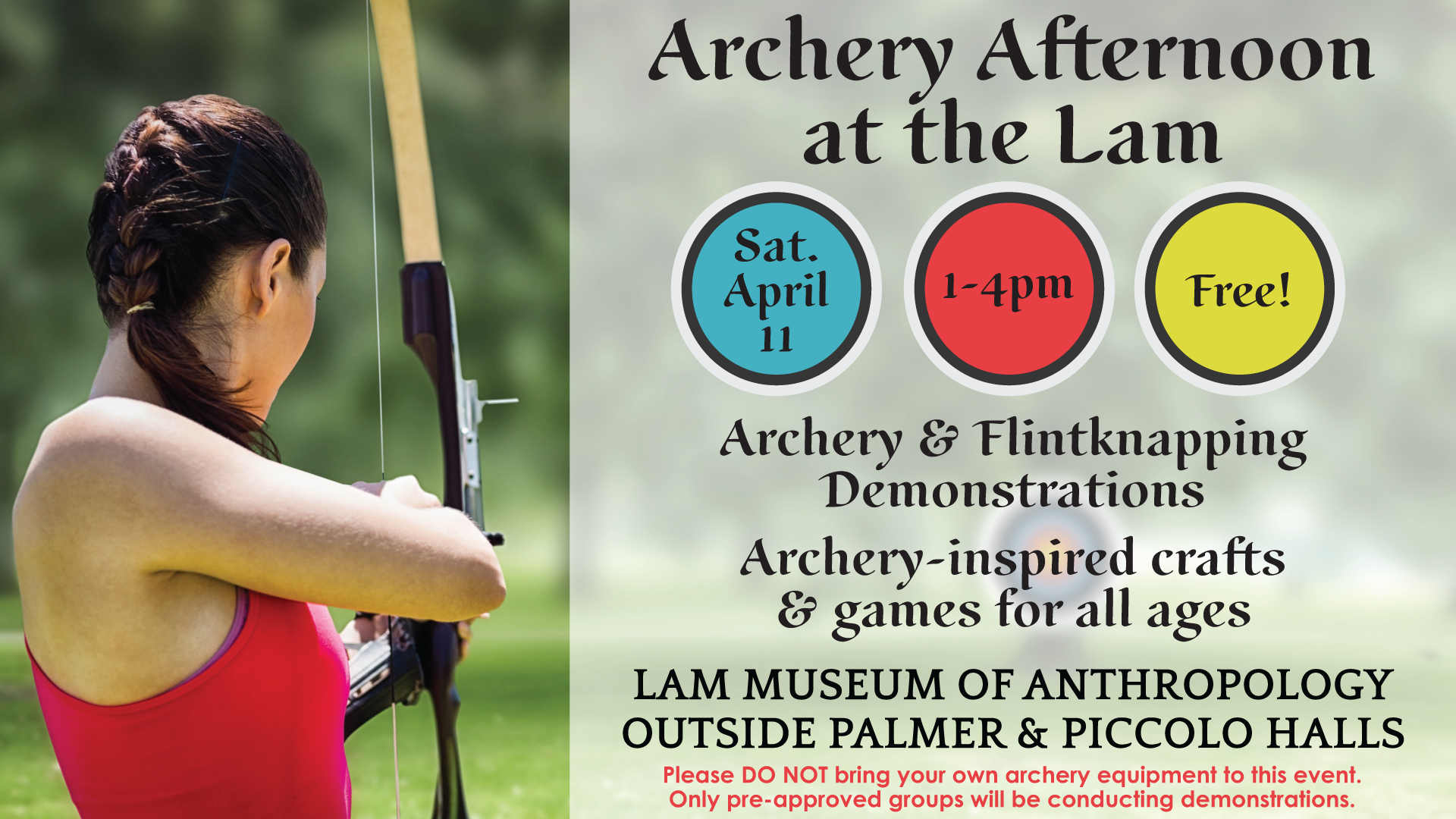 Visit the Lam Museum of Anthropology on Saturday, April 11, from 1 to 4 p.m. for Archery Afternoon at the Lam! Explore the world of archery through shooting and flintknapping demonstrations and archery-inspired crafts and games for all ages. This event is offered in conjunction with the exhibit “Archery: Hunting, Warfare and Identity.” Admission is free.