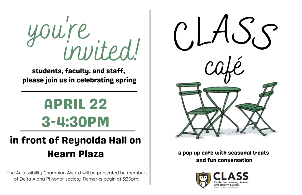 Celebrate the Spring Semester with CLASS by partaking in seasonal treats and fun conversation on Wednesday, April 22, from 3 p.m. to 4:30 p.m. on Hearn Plaza. Delta Alpha Pi, an academic honor society founded to recognize high-achieving students with disabilities, will present the 2026 Accessibility Champion Award to honor a faculty or staff member who demonstrates leadership in advancing the rights of individuals with disabilities. Remarks will begin at 3:30 p.m. This event is open to all faculty, staff, and students.
