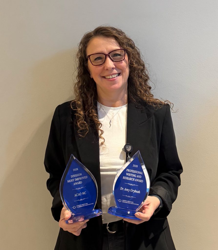 Dr. Amy Grybush, Assistant Professor of Counseling, received the Professional Writing and Research Award from the North Carolina Counseling Association. Additionally, the Association for Child and Adolescent Counseling of North Carolina (ACAC-NC) — the NCCA division that Dr. Grybush serves as Past President — also received the Most Improved Division Award from the NCCA.