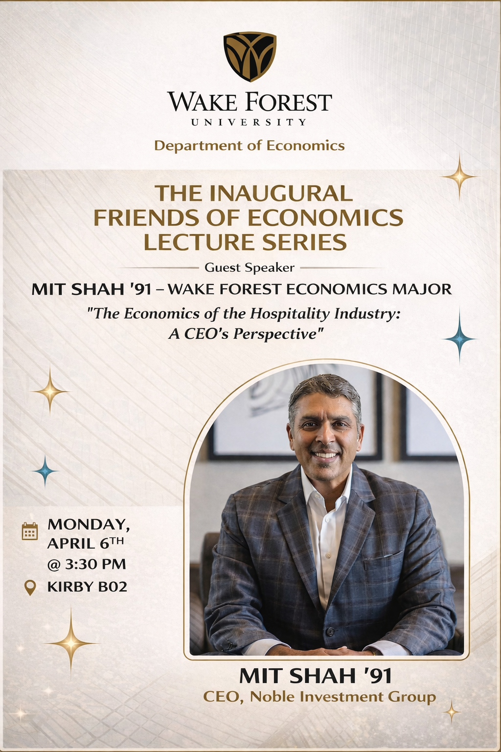 Join the Department of Economic for the Inaugural Friends of Economic Lecture series featuring guest speaker, Mit Shah, CEO of Noble Investment Group. The lecture will take place on Monday, April 6, at 3:30 p.m. in Kirby B02.