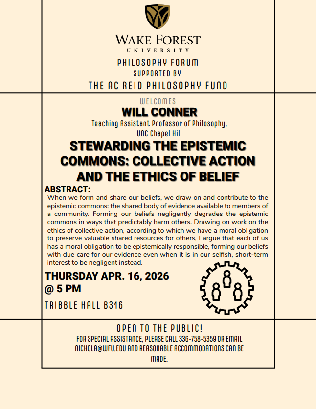 The Department of Philosophy will welcome Will Conner, Teaching Assistant Professor of Philosophy from UNC Chapel Hill, to present his talk “Stewarding the Epistemic Commons: Collective Action and the Ethics of Belief” on Thursday, April 16, at 5 p.m. in Tribble Hall, B316. Visit the Department of Philosophy website for a detailed abstract along with more information about the department’s speaker series.